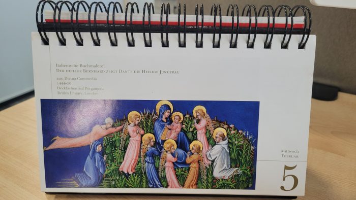 Über die in lateinischer Sprache verfasste Handschrift des Livro de Horas (Stundenbuch) de la Condessa de Bertiandos, aus der mich eine der 2066 detailreichen Buchmalereien heute wieder auf dem Büroaufsteller empfing, habe ich bereits am 29.Januar 2025 geschrieben und nicht damit gerechnet, der fantastischen Szenerie nochmals am gleichen Ort zu begegnen. Immerhin überlasse ich nach und nach reichliche handschriftliche Exzerpte dem Schlund des Spezial-Büro-Mülleimers und vertraue auf den sich ankündigenden Wechsel der Lebensjahreszeiten.