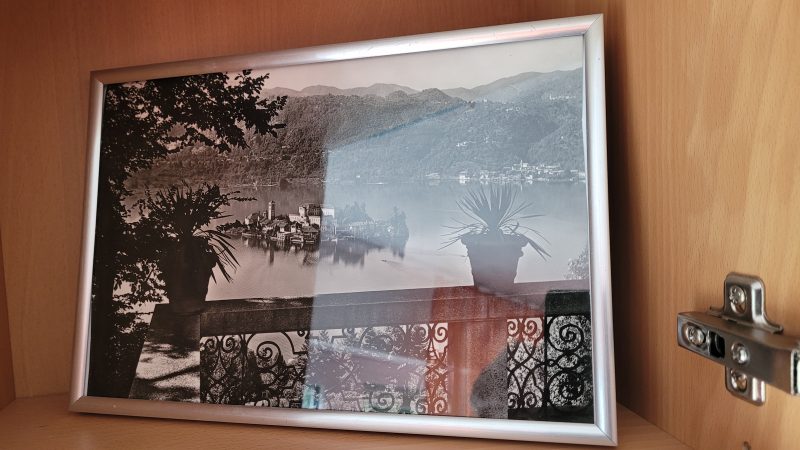 Das gerahmte Schwarzweiß-Foto habe ich in eine Vitrine des Raumes gestellt, den ich beginne, mein Schreibzimmer zu nennen. Auf meiner inneren Liste steht: Orta, Sacro Monte, Isola San Giulio in Farbe vor Ort erleben!