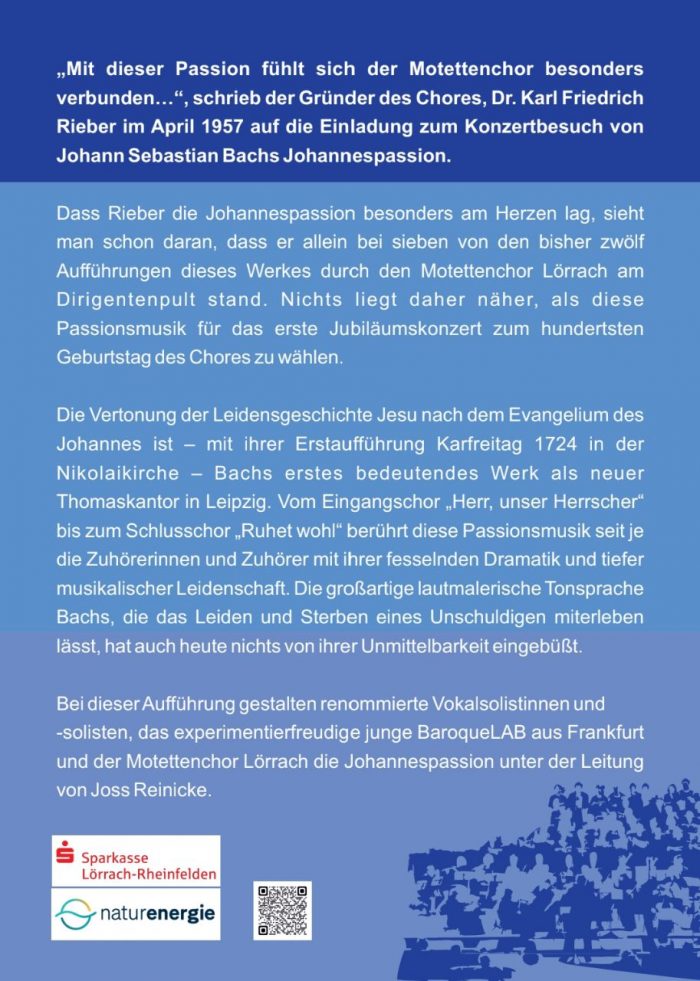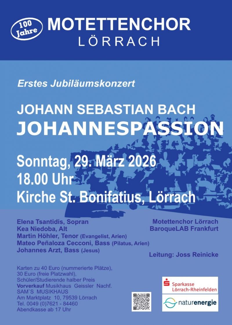 Einen Aschermittwoch kennt das Herrnhuter Losungsbüchlein nicht, aber der heutige Tag ist gesondert gekennzeichnet mit „Beginn der Passionszeit“. Eine Woche vor Ende der Passionszeit, am Palmsonntag (6.Sonntag der Passionszeit) wird der Motettenchor Lörrach beim ersten seiner beiden Jubiläumskonzerte zum 100-jährigen Bestehen des Chores die Johannespassion von Johann Sebastian Bach zu Gehör bringen, ein Werk, das zu den am meisten aufgeführten in der Geschichte des Chores gehört und eines, das „unglaublich narrativ, erzählend“ ist, wie der Dirigent Joss Reinicke in einem Zeitungsartikel äußert, eine szenische Komposition dergestalt, „dass man sich als Chor zeigen kann, sehr plastisch im Musizieren, in der Direktheit“. „Klangvielfalt durch neue Wege“ ist der Artikel der Badischen Zeitung vom 14.Februar überschrieben und Joss Reinicke charakterisiert den Chor und seine Ausrichtung darin so: „Der Motettenchor ist ein Klangkörper, der große Werke der klassischen Musik auf hohem Niveau dem Publikum zu Gehör bringt. Es ist unser Anspruch, eine Musikkultur, die reichhaltig ist, weiterzutragen und lebendig zu halten. Wir stehen für lebendiges Musizieren und Unmittelbarkeit.“ Zu Lebendigkeit, Flexibilität und Wachheit tragen neues Repertoire, neue Konzertorte, neue Formate, Zusammenarbeiten und Inszenierungen bei, für das zweite Jubiläumskonzert am 18.Oktober im Burghof Lörrach ist u.a. die Uraufführung eines Auftragswerks vorgesehen, das die Komponistin Elisabeth Fußeder (geb.2000) aus Freiburg schreibt, es greift Mendelssohns Vertonung der Goethe-Ballade ‚Die erste Walpurgisnacht‘ auf und trägt sie in die Gegenwart.