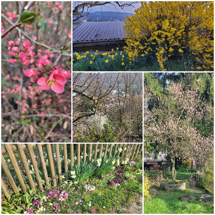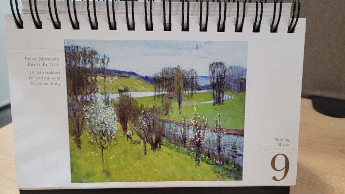 Kurz vor seiner Zur-Ruhe -Setzung koste ich den Büroaufsteller noch einmal voll aus – oder er mich – so genau lässt sich das nicht sagen. Der französische Maler Pierre Montézin (1874-1946), dessen Werke Teil des Malwettbewerbs bei den Olympischen Sommerspielen 1932 waren, hat sein Gemälde den ersten Blüten gewidmet. Am Hügel kann man schon nicht mehr nur von den ersten Blüten sprechen, eine wahre Frühlingsexplosion lässt alles auf einmal aufspringen, wo vor kurzem noch kahle Äste und nasses Herbstlaub die Oberhand hatten und einzelne Krokusse sich schüchtern vorwagten. Wann genau haben denn die Forsythien ihren Flammenwurf gestartet? Selbst die Magnolien können sich nicht mehr zurückhalten und überall schimmert vergnügt das lichte Weiß der Obstbaumblüten durch.