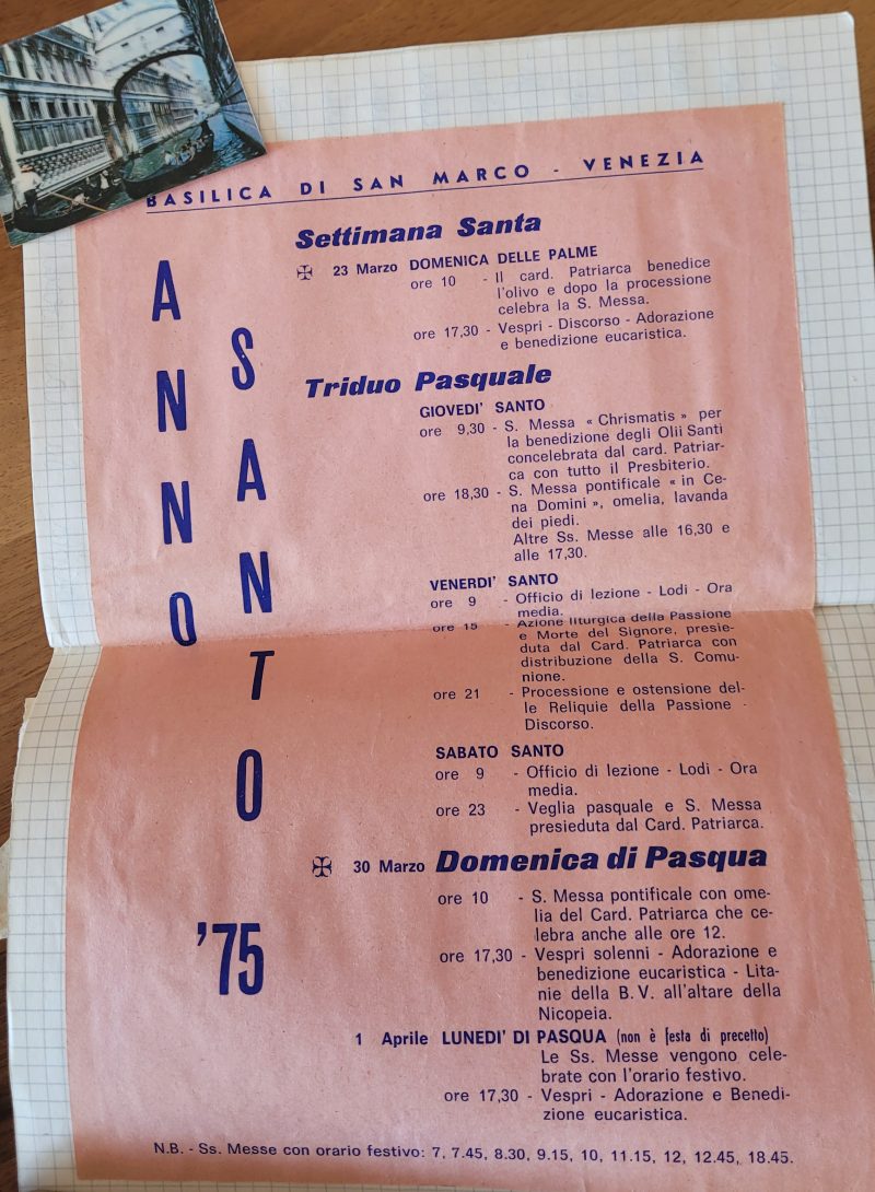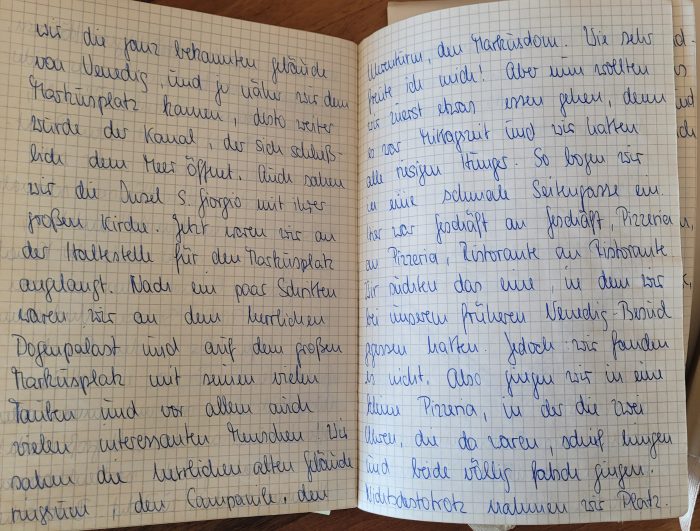 Nach dem Frühstück machten wir uns gleich auf den Weg, denn wir wollten nicht so spät nach Venedig kommen. Wie freute ich mich so furchtbar! Wenn ich von Venedig hörte, wollte ich immer einmal so gerne hin. Venezia (so heißt Venedig auf Italienisch) ist eines meiner Wunschziele. Wir waren schon einmal in Venedig, als wir im Urlaub in Jesolo waren. Jedoch war ich damals noch ziemlich klein (in dem Jahr wurde ich eingeschult), und so konnte ich mich kaum mehr erinnern. Und dass wir jetzt dahin fuhren, wo ich immer dachte, wann werde ich wohl einmal hinfahren können! Ich freute mich einfach schrecklich! Die Fahrt auf der Autobahn kam einem gar nicht lange vor, schon verließen wir sie in Mestre. Mestre: eine riesige Industriestadt mit gewaltigen Konzernen und vielen feuerspeienden, rauchenden Schornsteinen. Auch gab es hier große Häuserblocks, sie waren zwar schön angelegt, jedoch wohnen wollte ich hier überhaupt nicht. Schon waren wir durch das hässliche Mestre durch und fuhren auf die riesengroße, furchtbar lange Brücke nach Venedig auf. Hier sahen wir ein breites Stück des Mittelmeeres, der Adria. Als wir die Brücke hinter uns gelassen hatten, fuhren wir hinunter an das Wasser, wo ein großer, bewachter Parkplatz war. Hier ließen wir unseren Peugeot stehen. ….. Wir suchten den großen Bahnhof, in dessen Nähe die „Straßenbahn“ von Venedig abfährt, nämlich Schiffe, die einen an die bekannten und weniger bekannten Plätze Venedigs fahren. Hier begann schon das alte Venedig, die ersten kleineren Kanäle, die wir auf schönen Brücken überquerten. Jetzt gingen wir an einem größeren Kanal entlang, hier waren schon viele Geschäfte und Andenkenläden, und hier gab es die ersten Gondeln. Jedoch wir wollten mit dem normalen Linienschiff fahren, das in Venedig den Bus oder die Straßenbahn ersetzt und furchtbar billig ist. Jetzt ging es noch über eine große Brücke. Wenn man auf der einen Seite die Stufen aufwärts geht, sieht man die andere Seite nicht, auf der es wieder hinuntergeht, und man meint, geradewegs in den Himmel zu steigen. Viele Menschen hatte es auch hier, am Anfang von Venedig, auf der Brücke aus weißem Stein, auch junge Leute, die mit den Büchern in der Hand aus der Schule kamen und sich „Buona Pasqua“ (Frohe Ostern) wünschten. Bei ihnen begannen jetzt erst die Osterferien. Nun waren wir an der Haltestelle angelangt, an der die Schiffe abfuhren. Papa kaufte die Karten, und dann mussten wir noch eine Weile in dem überfüllten Wartehäuschen warten, das auf dem Kanal „schwamm“. Endlich kam das Schiff. Es wurde ziemlich voll und wir standen hinten draußen. Und nun ging die Fahrt los in Richtung Piazza S.Marco. Es war wunder-, wunderschön durch die schmaleren und breiteren Kanäle zu fahren, vorbei an alten, geschichtsträchtigen Häusern, Gebäuden und Brücken. Immer wieder zweigten kleinere Seitenkanäle ab, wo auch Menschen mit ihren Privatbooten fuhren. Immer wieder sah man zwischen den Häusern schmale Fußwege, die unvermittelt endeten, weil ja an dieser Stelle der Kanal vorbeiführte. …