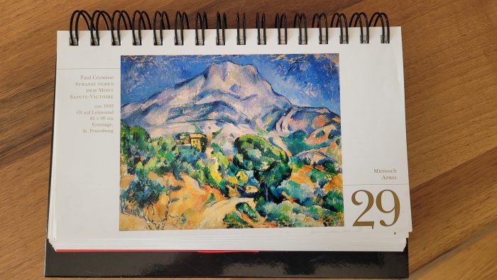 Die Montagne Sainte-Victoire aber lässt mich nicht los, sie meldet sich heute, als ich den Büroaufsteller aus einem der fünf Kartons ziehe, die weitere Büromaterialien beherbergen: der Aufsteller klappt ausgerechnet bei einer weiteren Cezanne-Variation des Gebirgszugs auf: Straße neben dem Mont Sainte-Victoire, um 1902, Ermitage St.Petersburg.