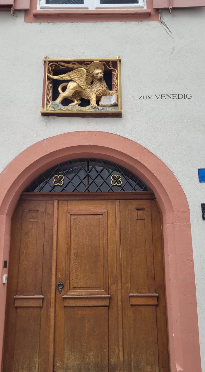 (Foto: Am Schlüsselberg in Basel findet sich ein 1470 entstandenes Relief des Markuslöwen als Hauszeichen am Haus zum Venedig, das einem Kaufmann mit Geschäftsbeziehungen zu Venedig gehörte. Von 1805 bis 1808 befand sich in diesem Haus der Betsaal der dritten jüdischen Gemeinde Basels, von 1824 bis 1891 war es Logenhaus der Freimaurer „Zur Freundschaft und Beständigkeit“, 1955 wurde es als Nebengebäude des Museums an der Augustinergasse umgebaut. Wie in vielen Darstellungen hält der Löwe mit seiner Pfote ein aufgeschlagenes Buch, in welchem man folgende Worte lesen kann: PAX TIBI MARCE EVANGELISTA MEUS – Friede sei mit dir, Markus, mein Evangelist)