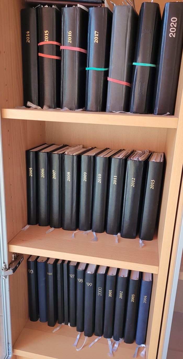 Seit vielen Jahren versuche ich, in Buchkalendern festzuhalten, was der Tag beinhaltet hat, ganz nüchtern, in Stichworten, auch das Wetter kommt hinein, zum Beispiel morgens trüb, dann hellt es auf, bis ~18°C oder morgens Nebelband über dem Rhein, sonst überw. sonnig, bis ~ 14°C. Ich habe so meine Vorstellungen, wie der Kalender auszusehen hat, in den ich schreibe, ich habe mich an Außen- und Innengestaltung gewöhnt. Vor allem muss er unbedingt eine ganze Seite pro Tag bereithalten, auch für die Samstage und Sonntage, zu Beginn der Zeilen soll die Uhrzeit gedruckt sein, zumindest die vollen Stunden. Ein Bändchen ist gut, mit dem man beim Aufschlagen schnell bei den aktuellen Tagen landet. Eine einseitige Monatsübersicht zu Beginn jeden Monats, ein paar für Notizen vorgesehene Seiten. „Mein“ Kalender ist gar nicht mehr so einfach zu finden oder er hat die gewünschte Innengestaltung, aber zeigt sich außen bunt und nicht im bevorzugten Schwarz. Für 2026 bin ich noch auf der Suche und dabei vielen Kalendern begegnet, aber nicht „meinem“. Zum Hineinschreiben nehme ich einen Stift mit feiner schwarzer Mine, keinen Kugelschreiber. Da ich seit einigen Jahren auch Eintrittskarten, Flyer, Quittungen o.ä. zwischen die Seiten lege, wird das Kalenderbuch mit einem Gummi zusammengehalten. Das ist zugegebenermaßen nicht besonders ästhetisch, aber bisher bin ich meinem System treu geblieben. Für unterwegs übrigens gibt es schmalere Kalender mit einer Doppelseite pro Woche, ich muss also gedrängter schreiben.