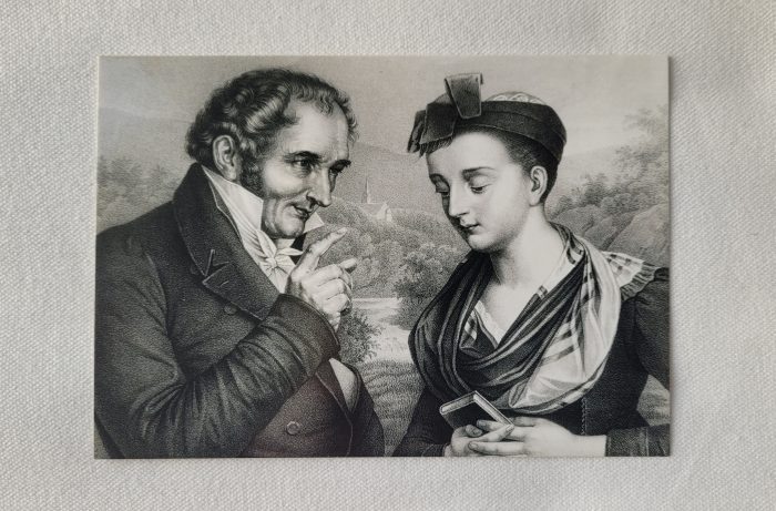Das Foto zeigt den 54-jährigen Johann Peter Hebel mit der 19-jährigen Elisabeth Baustlicher auf einer Lithographie nach einem Originalgemälde von C.J.A. Agricola, geschätzt um 1880. Die Lithographie gehört zur Sammlung des Dreiländermuseums Lörrach, die Postkarte habe ich vorgestern dort erworben. Eine Bildnisminiatur von Agricola (Doppelbildnis Johann Peter Hebel mit Elisabeth Baustlicher) befindet sich im Historischen Museum Basel. Das Motiv hieß gemäß Angaben des Hebelbundes in einem BZ-Artikel vom 16.04.2010 „Hebel und Vreneli“, es sind mehrere Varianten von Lithographie-Vorlagen erschienen, z.B. in Wien, in Karlsruhe und in Paris. „Hebel hat dieses Vreneli nie gesehen“ ist der Artikel überschrieben, das Doppelportrait von Agricola ist am unteren Bildrand genau beschriftet, so dass die Identitäten der Portraitierten, die sich nie begegneten, klar sind: Elisabeth Baustlicher von Langendenzlingen, alt 19 Jahr, gez. den 29.November 1814 von Carl Agricola. J.P.Hebel von Basel. Alt 56 Jahr. gez. den 6.December 1814 in Karlsruhe, C.A. (Eigentlich war Hebel zu diesem Zeitpunkt 54 Jahre alt). Über das Leben der 1795 geborenen Elisabeth Baustlicher aus dem heutigen Denzlingen (wo ich auch einmal eine Weile wohnte) existieren keine Aufzeichnungen. Man vermutet, dass mit der in Markgräfler Tracht Dargestellten Hebels Verbundenheit mit seiner ländlichen Heimatregion unterstrichen werden sollte. Hebel hatte auf alemannisch ein Gedicht verfasst „Hans und Verene“ (Alemannische Gedichte). Das Basler Doppelportrait war zum 225. Geburtstag Hebels im Jahr 1985 die Vorlage für die 80-Pfennig-Briefmarke der Deutschen Bundespost.