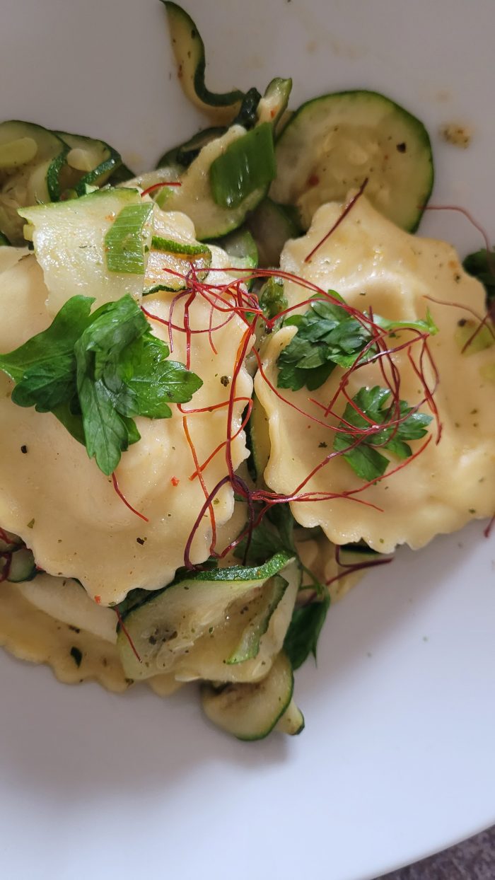 Dann hab‘ ich sie mitgenommen und ihnen ein kurzes Bad in Gemüsebrühe gegönnt, bevor ich sie in Olivenöl gewärmt habe. Dort hab‘ ich sie aber nicht alleine gelassen, sondern ihnen ein paar feine Lauchzwiebelröllchen und in dünnste Scheiben geriebene Zucchetti als Begleitung gegeben.