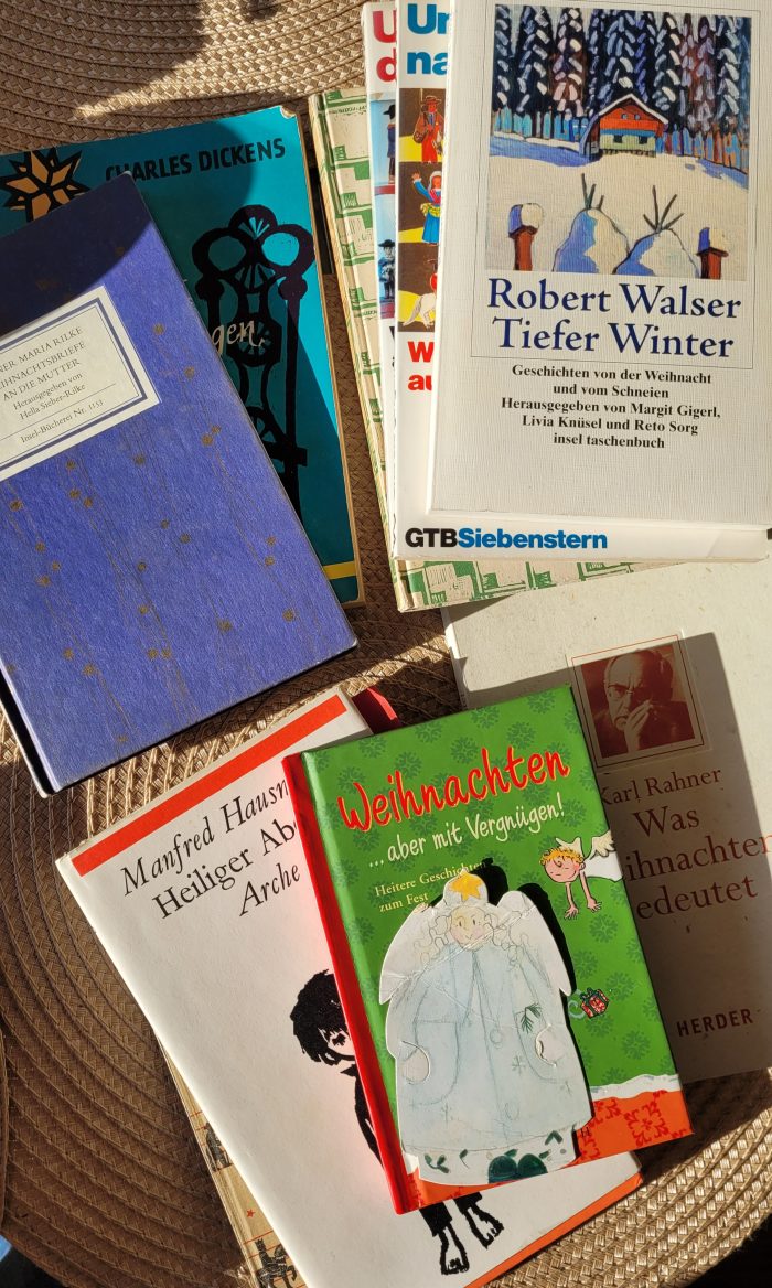 Oder man sollte weiter drüber nachdenken, ob man den Stapel saisonale Bücher jetzt sofort verräumt, obwohl man kaum dahinein geschaut hat, oder ob man ihn noch eine Weile liegen lässt. – Sie haben gar nicht darin gelesen? – Naja, es gibt in dem Stapel welche, da schaue ich zu gewissen Zeiten immer hinein. –  Aha, welche sind denn das und warum? – Tja, lieber Herr Spürnase, haben Sie da nicht eine Ahndung? Dann lasse ich es Ihnen als Rätsel, schließlich kann ich Ihnen nicht alles auf die Zunge legen – auch wenn es vielleicht schmackhaft wäre – womit wir endlich wieder beim Kochen angelangt sind! – Puuuh, ja dann, alla prossima!