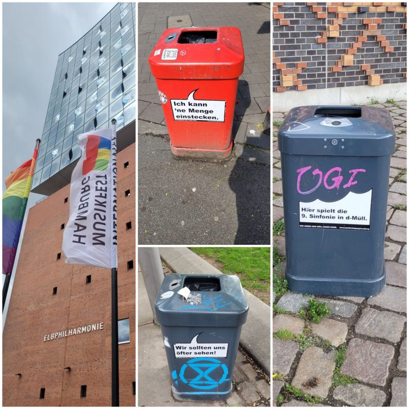 Ich sammle Mülleimer oder Mülleimer sammeln mich, so ganz genau weiß ich das nicht. Jedenfalls stehen sie überall herum, wo ich auch bin, und haben eine Meinung. Zu diesem und jenem. Nicht nur zu Symphonien. Oder Philharmonien. Die ich nur von außen hören und sehen konnte. So dass mir Hören und Sehen nicht verging. Irgendwann will ich die mal einstecken, so richtig in mich hinein. Oder besser: mich in sie hinein stecken. Zum Hören und Sehen. Und Riechen und Schmecken und Tasten. Also nicht in die Mülleimer, die haben’s ja ohnehin schon mit mir. Nee, aus- und einbaufähig sind Symphonien und Philharmonien, etymologisch und sonst wie. Sonst wie oder vielleicht sonst noch was? Ah ja, stimmt: Gleichgewicht und Bewegung! Da staunt ihr, Mülleimer, nicht wahr? Ha, so dynamisch seid ihr nicht! Eher festgefahren. Naja, dann bringt euch wenigstens nichts so schnell aus dem Gleichgewicht. Nicht mal Christian. Der hat sich nämlich gemeldet. Wenn auch nur kurz: