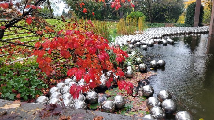 die kennt man von der am 22.März 1929 in Matsumoto, Japan geborenen Yayoi Kusama, der die Fondation Beyeler eine umfassende Retrospektive auf über 70 Jahre künstlerisches Arbeiten widmet – und in Form von 1200 glänzenden, gleichförmigen Edelstahlkugeln empfangen sie mich am sturmgebeutelten Tag bereits vor Betreten des Museums. In einvernehmlicher Nachbarschaft mit den gefallenen Herbstblättern ziehen sie ihre Bahnen oder sich in eine Teichecke zurück, Narcissus Garden ist der Titel der Installation, die die nicht geladene Künstlerin erstmals dennoch 1966 auf der Biennale in Venedig präsentierte.