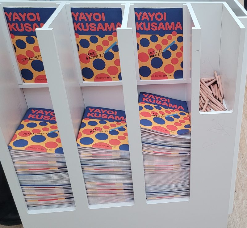 Ich nehme auch einen Bleistift, einen der kleinen, gut gespitzten, die neben den in Deutsch, Englisch und Französisch ausliegenden Mitmachheften für Kinder bereitliegen, dann kann ich vielleicht im Saalbooklet ein paar Anmerkungen notieren. Tatsächlich sind an diesem Donnerstagmorgen viele Kinder in der Ausstellung, eine ganze Gruppe im Kindergartenalter, munter trappeln sie durch die Räume, keine Ahnung, ob die Erzieherinnen die Kleinen von den freizügigen Performance-Videos in Raum 6 fernhalten, ich verliere die Gruppe aus den Augen und das Mitmachheft sagt dazu nichts. Eine Züricher Stiftung ermöglicht Kindern und jungen Menschen bis 25 Jahre ein Kunstvermittlungsprogramm und freien Eintritt in die Fondation.