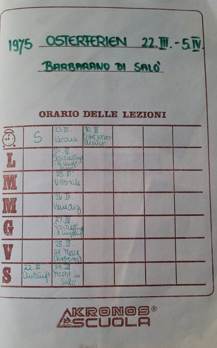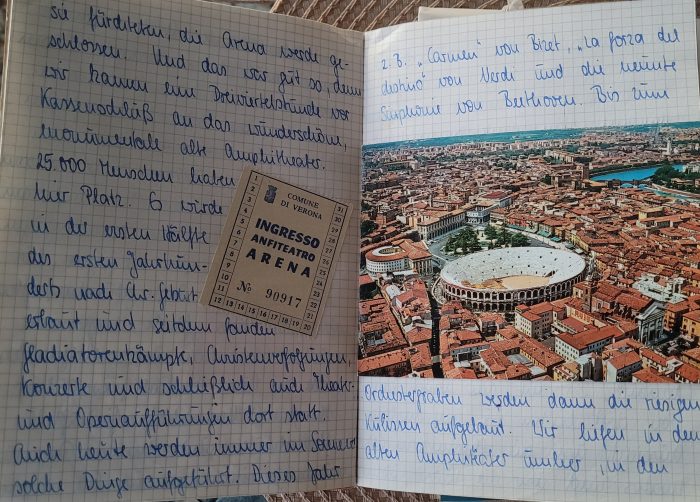 Unser erstes Frühstück in der Küche der Casa Palma war sehr fein. Nachdem wir uns so gestärkt hatten, gingen wir zu Fuß in den bekannten Kurort Gardone Riviera…Wir spazierten durch schöne enge Gässchen, über einen schönen kleinen Platz und dann Lungolago, d.h. die herrliche Promenade am See entlang. Es ist gut, dass noch nicht so ein Betrieb ist wie im Sommer. Dann lernt man die Orte viel besser kennen, finde ich. Die Promenade ist, glaube ich, ganz auf den See gebaut, denn in bestimmten Abständen sind immer wieder Dohlen, durch die man das Wasser sieht. Durch diese Dohlen fischen auch die Einheimischen solch kleine silbrige Fische. Es sieht sich ungeheuer komisch an. Nach diesem Spaziergang gingen wir wieder in eines der kleinen Gässchen in das Ristorante des Hotel Nord. Hier wurden wir von einer Südtirolerin, die gut Deutsch sprach, freundlich bedient. Wir bestellten jeder ein Menu. Es war aber furchtbar viel, und D. und ich konnten nicht alles aufessen. Als Vorspeise aßen D. und ich Spaghetti, Mama und Papa Gemüsesuppe. Als Hauptgericht nahmen Papa, D. und ich Fleisch mit Kartoffeln, während Mama gebackene Forelle (auf Italienisch: trota) mit Kartoffeln aß. Dann folgte als Dessert Caramelpudding bzw. Obstsalat. Natürlich tranken D. und ich, wie immer in Italien, Aranciata. Oh je, waren wir satt nachher, und wir schworen uns, nie mehr ein ganzes Menu zu bestellen. Jetzt wanderten wir gemütlich wieder ‚heim‘. Hier suchten wir die Liegewiese, die im Prospekt angezeigt war. Nun, Liegewiese ist etwas übertrieben, es ist ein kleiner Platz mit mehr Steinen als Gras, aber mit einem schönen grünen Holztisch und dazugehöriger Bank, einem Sandplatz, zwei Umkleidekabinen, ein paar guten Bäumen, auf die man ein Stück weit hinaufklettern kann (besonders wichtig für D.!), und eben am See. Wir setzten uns gemütlich ein Weilchen auf die Bank, doch war es hier nicht sehr warm, weil trotz Sonnenschein ein ziemlich kalter Wind ging, was hier am Gardasee für diese Jahreszeit ungewöhnlich ist. Wir fassten einen Entschluss, über den ich mich sehr freute: wir beschlossen, nach Verona zu fahren. Um halb vier ungefähr machten wir uns auf den Weg, und auf der Autobahn waren wir ziemlich schnell in Verona angelangt. Wir fuhren in die herrliche alte Stadt hinein und parkten das Auto auf einen Platz vor der Kirche Sant‘ Anastasia. Nun gingen wir zu Fuß durch die alten Straßen und Gassen, es war wunderschön. Wie freute ich mich! Mama und ich konnten auch gut einer unserer Lieblingsbeschäftigungen nachgehen, nämlich: Leute beobachten! Unser Ziel war, die alte Arena von Verona zu sehen. Doch zuerst stärkten wir uns in einem Café an einer Piazza, die von schönen alten Häusern umstellt war, mit Cappuccino und Tee. …“
