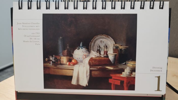 Tag 1 im Dezember ist ein Büroaufstellertag. Immerhin gibt es einen Küchengruß aus dem Musée du Louvre von Jean Siméon Chardin (Nov.1699-Dez.1779), dessen Stillleben und Genrebilder sich durch außerordentliche Klarheit und Bescheidenheit auszeichnen, wie Wikipedia mir sagt; er malte auch so hübsche Dinge wie einen Erdbeerkorb, auf dem sich besagte Früchte pyramidenförmig türmen oder eine Brioche, aus der es blüht. Da möchte man sofort zugreifen und einverleiben, tja, vielleicht legt einem ja auch das fotografierte Gemälde ein wenig Geschmack auf die Zunge -doch, das gibt eine gute Mélange, Walderdbeeren und Brioche, und dann schauen wir mal,was die Terrine für uns bereithält.