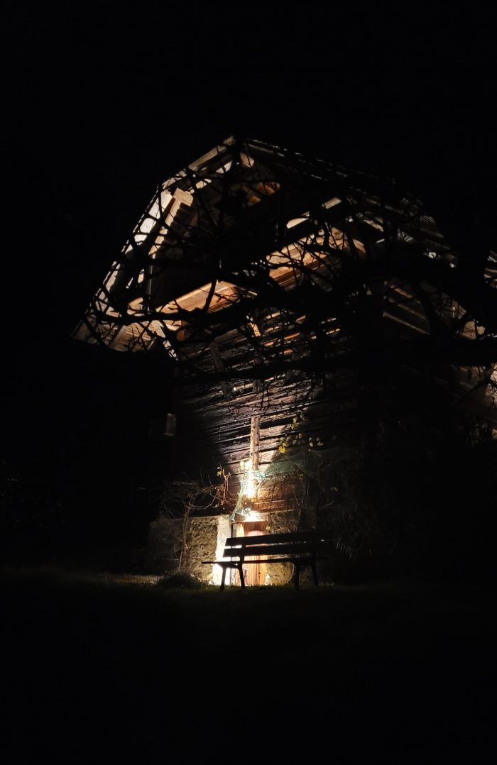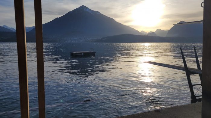 Der Festtagscharakter bleibt dem Donnerstag in Ralligen erhalten, am Abend werde ich mich einigen Brüdern und Hausgästen anschließen und nach dem Essen ein weiteres im Tongeschirr gereichtes Mahl zelebrieren, nachdem wir durchs Dunkel den Feldweg hinauf gepilgert sind zur Wegkapelle, dabei an Lichtstationen innegehalten und uns mit Worten in Lesung und Gesang gestärkt haben. Laudate omnes gentes, laudate dominum – die wiederholten Schleifen des Liedes laufen uns aus der Kapelle voraus und legen sich in klarer Nacht aufs Schwarz der Landschaft. Erreichen sie auch die Himmel, in denen die Sterne ein entschiedener Widerschein unserer kleinen Lichter sind ? Stern über Bethlehem, zeig uns den Weg… werden wir später noch intonieren, denn das Singen will an diesem Abend kein Ende nehmen, beim Feuer im Kaminzimmer finden sich Etliche zusammen und folgen der Pianistin besinnlich bis spritzig. Zuletzt kredenzt jemand sogar noch Eis, flankiert von Sahne, aus den Tiefen der Küche. Die Wegkapelle war mir bereits am Ende des Morgenrundganges ein Ziel, eine geteilte Holztür ließ sich mit Riegeln öffnen, auf dem aus unregelmäßigen Steinen gepflasterten Boden der ehemaligen Scheune fand ich rote Sitzkissen auf Strohballen, vor dem Kreuz an der Stirnwand eine Krippe, in der aus weißen Laken das Kind seine Ärmchen hochreckt. Ist das Kind aus Ton oder dunklem Holz gefertigt? Ich versage meiner Hand die Berührung. Nischen der Bruchsteinwände nehmen Kerzen und Bücher auf, verschiedene Bibelausgaben sind es vor allem. Auf einfachem Ambo liegt das fünfte Kapitel des Matthäusevangeliums aufgeschlagen, die Verse eins bis zehn der Seligpreisungen sind fett gedruckt, genau wie die Verse dreizehn und vierzehn, die von Salz und Licht handeln: Ihr seid das Salz der Erde. Ihr seid das Licht der Welt. Über der geöffneten Bibel hat man einen von Beat Rinks Sätzen auf den Ambo gelegt: Eine Kirche, die nie nach Stall riechen wird, verleugnet ihre Herkunft. Die Wegkapelle tut das nicht, der gestaltende Künstler hat ihren Scheunencharakter bewahrt, durch die Öffnungen der hölzernen Wand- und Dachsparren-Konstruktion fällt das Himmelslicht herein und der Blick hinaus auf Bergwiesen, auf See und Niesen. Giemwand heißt wohl der Fachausdruck für den Aufbau der Scheune, am Nachmittag lese ich das in Gunten auf blechernem Schild, das auf eine alte Scheune als letzten Zeugen von kleinbäuerlichen und kleingewerblichen Tätigkeiten im Dorfkern hinweist. Neben der Wegkapelle sind bäuerliche Tätigkeiten noch alltäglich, mittags wurde beim nahen Misthaufen mit dem Schaufeltraktor geschafft, der Stallgeruch verteilt. Nach Gunten laufe ich nicht auf der Höhe, sondern am See entlang, ich raste auf Bänken, die sich Wasser und Sonne zuwenden, ab irgendwann taucht im Blick Richtung Interlaken das schneeweiße Antlitz der Jungfrau auf, im verwaisten Guntener Strandbad weist ein Schild darauf hin, dass Tauchen hier eine Wintersportart und im Sommer verboten sei, und tatsächlich begegnen mir beim Zurückgehen an den Rastplätzen Menschen, die sich aus tauchtauglichen Anzügen schälen und ihr Equipment in den Kofferräumen ihrer Kombis verstauen. Auch auf diesem Gang wandert der Niesen immer mit und später, als er in der Nacht kaum auszumachen ist, werde ich denken, dass er selbst der Dunkelheit des Himmels ein treuer Begleiter ist.