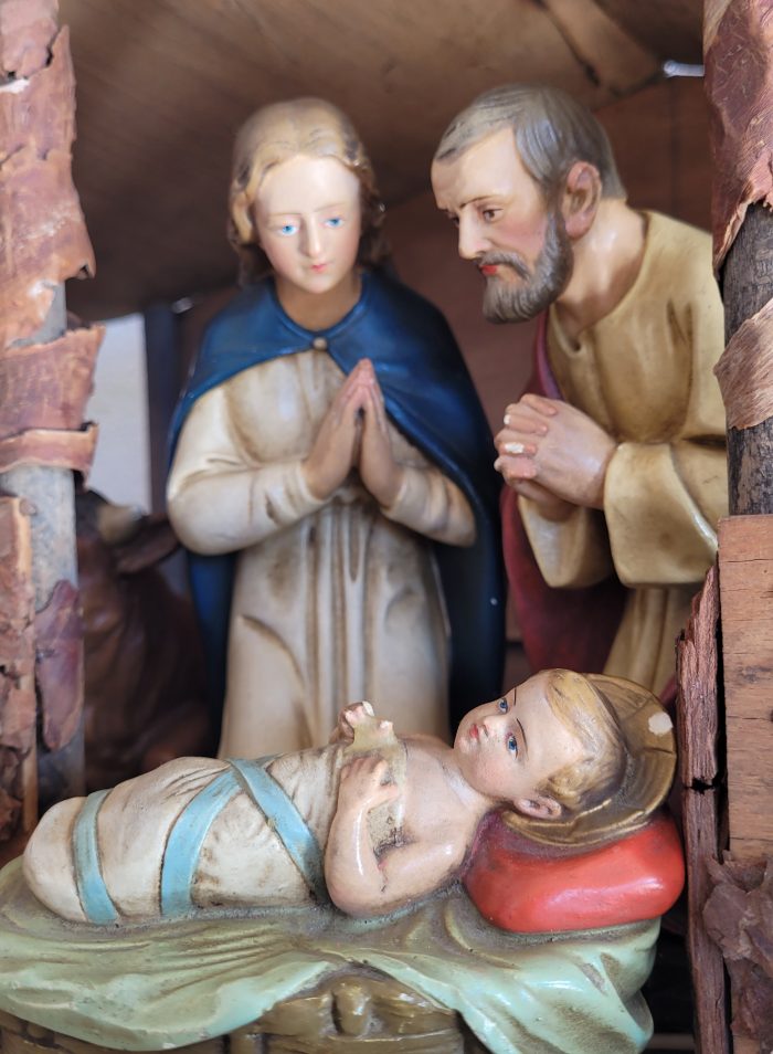 (Foto: Über was Josef wohl hier nachdenkt? Bestimmt nicht darüber, wann er wieder in die Kiste der Krippenfiguren verräumt wird. In meiner Kindheit standen die Figuren jedenfalls immer mindestens bis zum Geburtstag der Mutter, der mitten zwischen Epiphanias und Mariä Lichtmess lag)